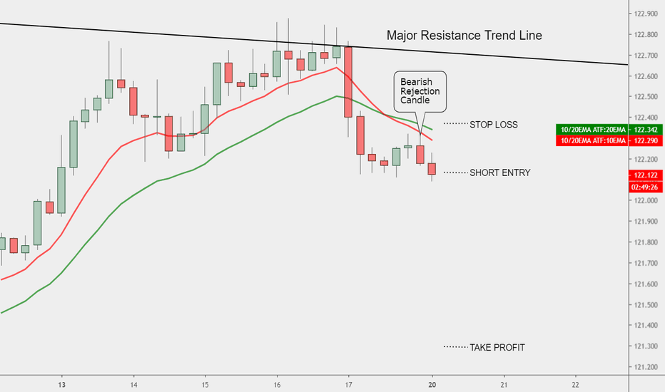 EURJPY has formed a bearish rejection candle bouncing off 10 period EM