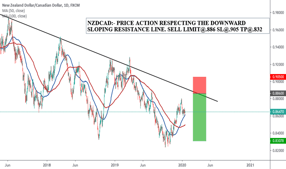 NZDCAD:- PRICE ACTION RESPECTING THE DOWNWARD SLOPING RESISTANCE LINE.